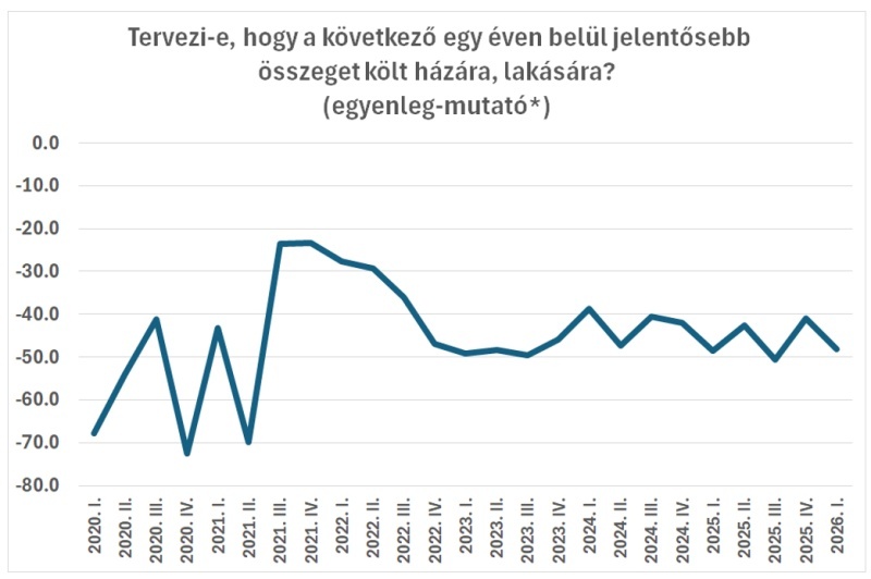 A GKI 2026. januári lakossági felmérése szerint a megkérdezettek 6%-a biztosan, 18%-a valószínűleg nagyobb összeget fog költeni lakóingatlanára a következő egy évben. Az elmúlt három esztendőben a lakosság lakásfelújítási és korszerűsítési szándékai csak enyhe hullámzást mutattak, határozott tendenciát nem. Az Otthonfelújítási Program lezárása óta az emberek jelentős része várakozó pozícióba került, vélhetően új, széles körben elérhető támogatási formák megjelenésére számítva. Ezeket az építőipari szereplők is fontosnak tartanák.