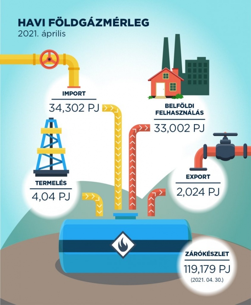 Az országos primer energiatermelés 2021. áprilisban 37,31 PJ volt, ami 1,42 PJ-lal magasabb az előző év azonos időszakához képest.