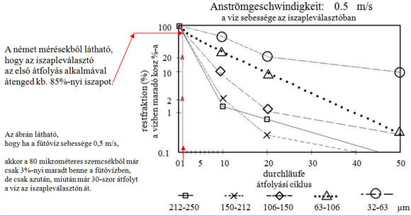 CIKLUS 1: mivel nyáron áll a fűtés, emiatt hűvös a fűtővíz, emiatt sokkal több oldott oxigént tartalmaz mint télen, így nyáron jóval nagyobb a korrózió minden fűtési rendszeren belül. Sajnos sokan nem tudnak erről. Nyáron tehát korróziós iszapok keletkeznek. És egyszer csak ősz lesz, az idő hidegebbre fordul. Elindítják a fűtést, tehát elindul a szivattyú is. Ettől viszont felzavarosodik a nyáron keletkezett és leülepedett korróziós-iszap (főleg hogy a felújított fűtésekben még a vízsebességek is nagyobbak), és iszapos víz érkezik a visszatérő-csövön át. És hiába van egy iszapleválasztó a kazán visszatérőjében, hiszen ez az első átfolyás alkalmával átengedi a koszok kb. 85%-át (a mágneses iszapleválasztó is átengedi kb. a koszok felét az első átfolyás alakalmával). Nézze meg az 1-es ábrán a német méréseket, ahol a vízszintes tengelynél 1 átfolyásnál menjen fel a görbékre, majd a függőleges tengelyen leolvasható az átfolyás után a vízben maradó koszok %-a, ami most kb. 85%. Megemlítem, hogy az örvénykamrás-mágneses iszapleválasztók jóval kevesebb koszt engednek át, de ezek sem nyújtanak tökéletes megoldást. Ez a CIKLUS zajlik minden esztendőben. Minden nyáron újabb és újabb korróziós iszapok keletkeznek, így minden ősszel, amikor először indul el a fűtési szivattyú, ÚJABB koszok jutnak be a kazán fűtővíz-járataiba.