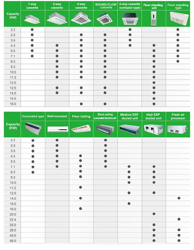 Az elérhető beltéri egységek egyaránt kompatibilisek a CMV-X, és a CMV-mini kültéri egységekkel. Más gyártókkal ellentétben minden CHIG VRF beltéri egységhez jár egy standard vezérlő, ez típustól függően lehet infra, vagy fali szabályzó.