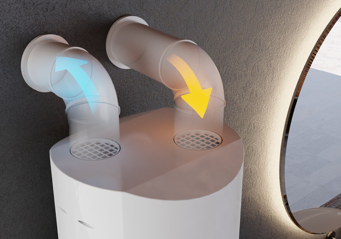 A rendszer lehetővé teszi mind a direkt levegővételt, mind a csatornázott kialakítást, például: