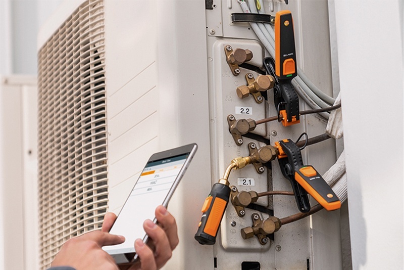 A csipeszes okosérzékelőt továbbá hatékonyan tudjuk használni klíma- és hőszivattyús rendszereken is. Ezen mérésekhez érdemes a testo 549i nagynyomásmérő műszert is használnunk, amit önállóan vagy szettben is beszerezhetünk. A testo Smart Probes hűtéstechnikai szett két-két darab testo 115i és testo 549i műszert tartalmaz, amely elegendő az előremenő és visszatérő ág hőmérsékletének, illetve az alacsony és nagynyomás oldalon végzett egyidejű méréshez is, mindezt pedig egy praktikus szállítótáskában tudjuk rendszerezni. A szettel ezáltal mérhetővé válik a rendszer elvárt túlhevítés vizsgálata, illetve a túlhevítés és utóhűtés számítása is. Ezen mérések esetén az alapnézeten túl a hűtéstechnikai és a differenciál hőmérséklet mérési nézetek még a praktikusak.