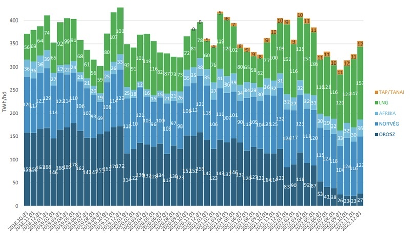 Decemberben az orosz csővezetékes szállítás előző évinél 80%-kal volt alacsonyabb, az LNG import 44%-kal emelkedése a kieső orosz forrás 60%-át kompenzálta. Az orosz források aggregált csökkenésén belül a Török Áramlaton érkező orosz gázimport 7%-kal emelkedett.