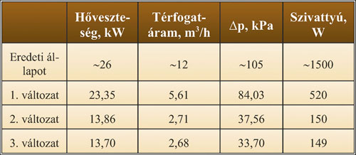 Az egyik márkakereskedő árajánlatában a szelepek olcsóbbnak bizonyultak, de a két ajánlat között csekély volt az árkülönbség. A kivitelezők által elérhető kedvezmények ezt az ársorrendet akár meg is fordíthatják. Mivel a két ajánlat műszaki tartalma lényegét tekintve azonos volt, a szerelvények kérdését e cikkben nem taglaljuk, és a továbbiakban csak a fő tervváltozatok tanulságait ismertetjük. Az egyes változatok vizsgálatának fontosabb eredményeit az 1. és 2. táblázat tartalmazza.