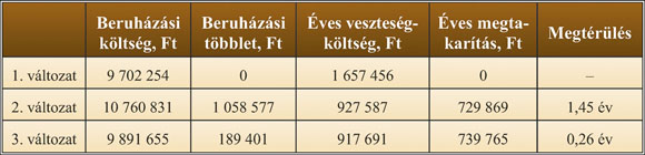2. táblázat. A vizsgált változatok költsége és megtérülései
