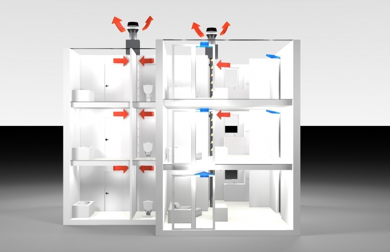 A friss levegőt a komfortterű helyiségekbe vezetjük be páraszabályozott légbevezető elemekkel, míg az elhasznált levegőt a kiszolgáló helyiségeken keresztül szívjuk el és vezetjük az épületen kívülre. A helyiségek közötti szabad levegőáramlás a belső küszöbök elhagyásával biztosítható.