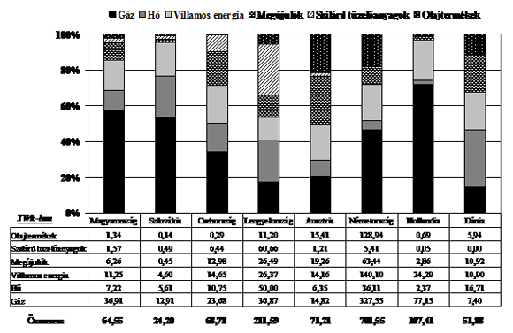 Az 1. ábra néhány nyugat- és kelet-közép-európai ország háztartásainak összesített éves energiafelhasználását, illetve a felhasznált energiahordozók arányát mutatja be. Pár érdekes dologra érdemes felhívni a figyelmet. Feltűnő, hogy Csehországban, de főleg Lengyelországban máig milyen jelentős a szénfelhasználás aránya. Ezzel szemben Magyarországon – különösen, ha a csaknem tisztán gázalapú távhőt is figyelembe vesszük – közel 70%-os a háztartási energiafelhasználásban a földgáz hányada. Nem is véletlenül választási kampánytéma a gáz ára a rendszerváltozás óta. Az osztrák háztartásokban ezzel szemben 25% fölött van a zöldenergia-felhasználás – tudjuk, hogy Ausztria környezetbarát ország –, és 20% fölötti az olajtüzelés aránya. Az Alpokban kevésbé forszírozták a gázvezeték-építést, így a síparadicsomok jó részében télen olajjal fűtenek. Hollandia sík, és jelentős saját gáztermelésük is van, így nem meglepő, hogy ott 70% fölötti a háztartások energiafelhasználásában a földgáz aránya. Dániában köztudottan nagy szerepe van a kapcsolt energiatermelésre alapozott távhőnek, és az osztrákokéhoz mérhető a megújuló energia használata is. A háztartásokban felhasznált villamos energia aránya szinte minden vizsgált országban 20% körüli.