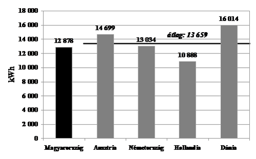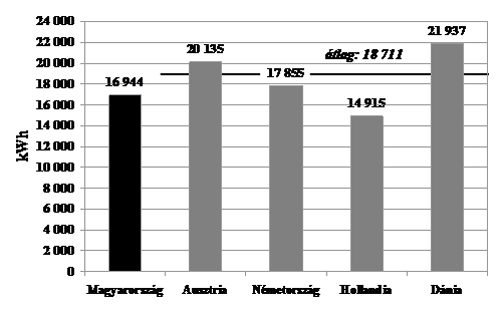Említettük, hogy a háztartási energiafelhasználásban domináns szerepet játszik a fűtés, annak mintegy háromnegyedét adja (lásd 3. ábra). Ezt nemzetközi összehasonlításban, háztartásonként, kWh-ban számszerűsítve mutatja az 5. ábra.