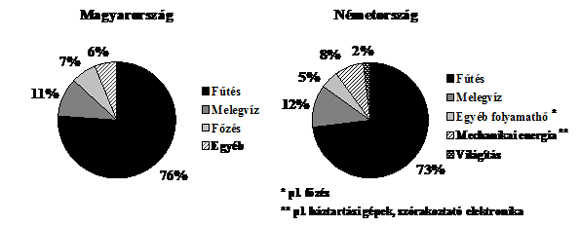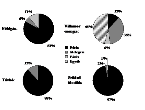 Az előbbiekben megállapítottuk, hogy a magyar háztartások fűtési célú energiafelhasználásából kb. 30%-ot lehetne megtakarítani, ha fajlagosan ugyanannyi hőt használnánk fel, mint a nyugat-európaiak. Ezek után érdemes egy nagyságrendi becslést adni arra, hogy mindez a gazdaság mikro-szintjén, a háztartásokban, pénzben kifejezve mit is jelent. A KSH adataiból ismertek az éves háztartási energiaköltségek energiahordozók szerint10, melyekből – annak ismeretében, hogy az egyes energiahordozók mekkora részét fordítják a háztartások fűtésre – meghatározható az éves fűtési költség. A 8. ábra mutatja, hogy az egyes energiahordozókat milyen arányban használjuk különböző célokra. Ezekre az arányokra építve az éves fűtési költség számítását az 1. táblázat részletezi.