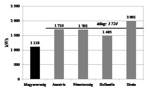 Az egy főre jutó éves háztartási villamosenergia-felhasználást mutatja a 4. ábra. Célszerű egy főre vonatkoztatni, mert a fogyasztás – amely a mosógép, a hűtőgépek, a bojler, a vasaló, a szórakoztató elektronika, a tűzhely és más, hasonló eszközök használatából tevődik össze – inkább függ a lakók számától, mint a lakás méretétől. A magyarországi 1118 kWh/fő-vel szemben a nyugat-európai országok átlaga 1724 kWh/fő, tehát a nyugatiak jó harmadával több villanyt fogyasztanak egy főre vetítve, mint mi.