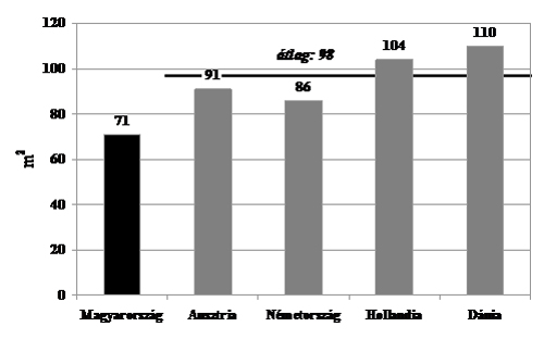 Egyszerűsítésként úgy számoltunk, hogy a fűtés részaránya a teljes háztartási energiafelhasználáson belül minden nyugat-európai országban megegyezik a németországival (73%). Célszerű valamilyen fajlagos mutatót képezni a fűtési energiafelhasználás hatékonyságának összehasonlítására. Mivel a fűtésre felhasznált energia leginkább a lakás méretével van összefüggésben, így ezzel arányosíthatunk. A lakások belmagasságának eltéréseit elhanyagolva az alapterületre (amelyre vonatkozóan inkább elérhetők statisztikai adatok) vetítettük az energiafelhasználást. Az átlagos lakásméreteket hasonlítja össze a 6. ábra. Ebből látható, hogy bár a fűtésre használt energia mennyiségében nincs jelentős eltérés hazánk és Nyugat-Európa között, az utóbbiak sokkal nagyobb alapterületű lakásokat tudnak közel ugyanannyi energia felhasználásával fűteni. Ha az éghajlatbeli különbségeket a napfokszámok8 segítségével korrigáljuk (a nyugat-európai hőmérsékleti értékeket érvényesítve Magyarországra), a hazai fajlagos érték még kedvezőtlenebb.