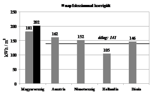 Az egyes országok fajlagos fűtési energiafelhasználását mutatja a 7. ábra, egy évre vonatkozóan. Az ábrán látszik, hogy Nyugat-Európa átlagosan mintegy 30%-kal kevesebb energiát használ fel fajlagosan, mint mi, magyarok. Az okok többfélék. Itthon nyilvánvalóan rosszabbak a nyílászárók, rosszabb a szigetelés, nem elég korszerűek a fűtőberendezések, nincs megfelelő hőmérsékletszabályozás. Mindezek mellett azonban új szemléletre is szükség van. Oda kell figyelnünk arra, hogy egy lakásban – de a közintézményekben is – 20 °C körüli hőmérséklet is elég, amelyet, ha nem vagyunk otthon, tovább lehet csökkenteni. Hányszor tapasztaljuk, hogy egy üzletközpontban a pénztáros ujjatlan pólóban jól érzi magát, miközben mi, vásárlók télikabátban, gyöngyöző homlokkal várjuk a sorunkat? Ekkora terek fűtésénél vajon mennyi energiát pazarolunk el feleslegesen? De ugyanez a pazarlás érhető tetten az állami és önkormányzati intézményeknél is, a minisztériumoktól a színházakon és az iskolákon át egészen a laktanyákig. Itt lehetne (és kellene) példát mutatni a társadalom kisebb egységeinek, köztük a háztartásoknak is.