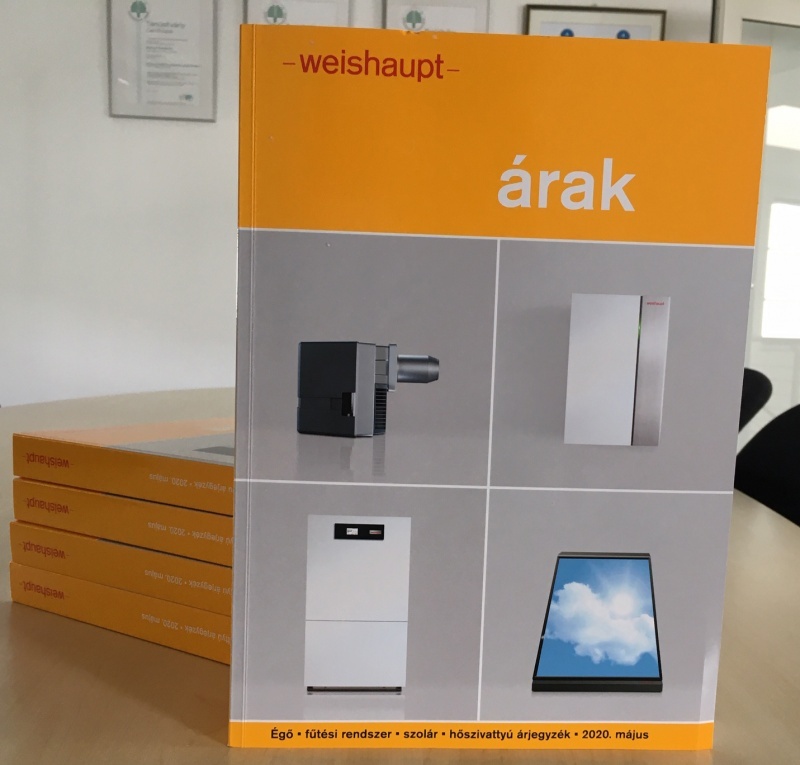 A sokszázoldalas, díjmentesen kérhető kiadvány tartalmazza a Weishaupt kompaktégők (550 kW-ig) és tartozékaik, az olaj és gáz kondenzációs kazánok (1400 kW-ig) és tartozékaik árait. Minden fejezetben ábrák, kapcsolási rajzok állnak rendelkezésre annak érdekében, hogy a kivitelező könnyen el tudjon igazodni.