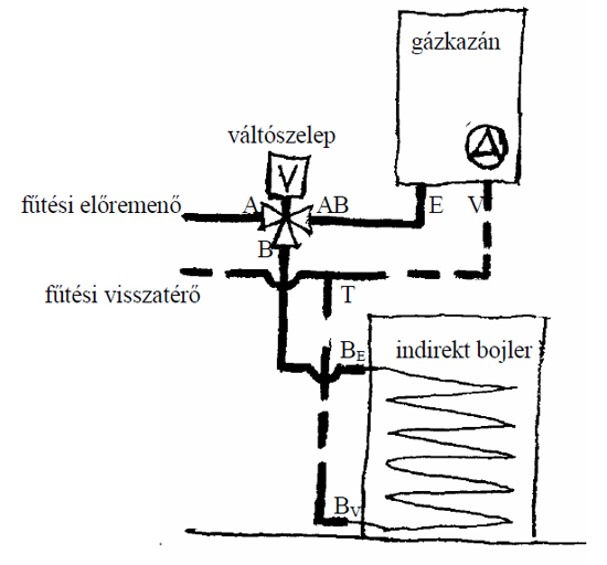 Kérem, most nézze a felső ábrát, tehát legfelül a kérdésnél szereplő ábrát! Könnyű belátni, hogy amikor a váltószelep bojler ágban van nyitva és már befejeződött a bojler felfűtése és leállt a kazán szivattyúja, akkor