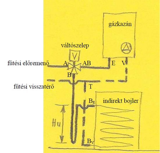 Ha nincs gravitációs „Hu” hurok (a hurok mélysége minimum 12 Dkülső, de tapasztalataim szerint inkább/minimum 12 Dkülső de(!) minimum 0,5 m/ ), szóval ha nincs gravitációs „Hu” hurok, akkor a következő igen jelentős bojler-hőveszteség keletkezik: