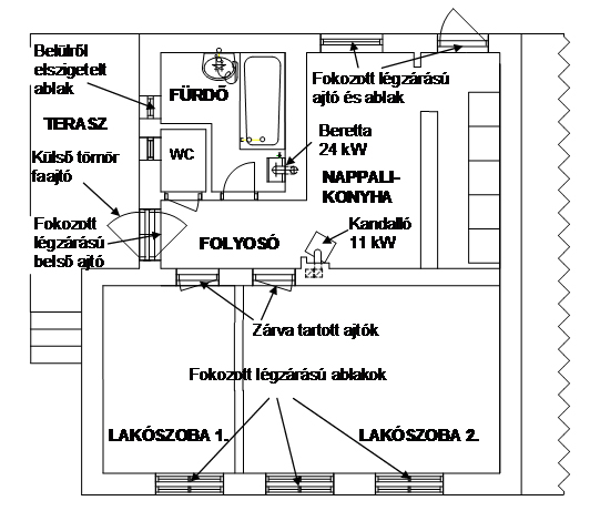 A bejáratra két ajtó volt felszerelve, egy külső tömör faajtó és egy fokozott légzárású belső ajtó, melyek mérete 70x200 cm volt. A nappali-konyha helyiségben egy 120x180 cm-es fokozott légzárású ablak és egy 70x200 cm-es fokozott légzárású ajtó került utólag beépítésre. A két, alaprajzon feltüntetett lakószobában összesen három darab fokozott légzárású ablak volt.