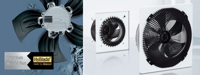 Ebm Papast HiBlade ventilátor (balra) és a szívóoldali beömlőrács (jobbra).