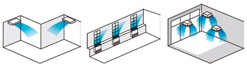 Ha a helyiség szabálytalan alakú, elnyújtott, vagy nagy benapozott nyílászáró felületekkel rendelkezik, a fűtő-, hűtőteljesítmény egyenletes elosztása is biztosítható Fujitsu szimultán multi rendszerrel. A beltéri egységek elhelyezhetők a mennyezeten, álmennyezetben, ablak alatti parapeten eltakart vagy burkolatos kivitelben.