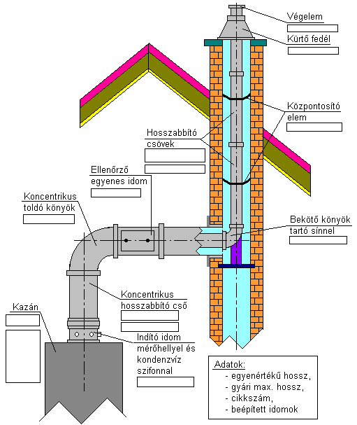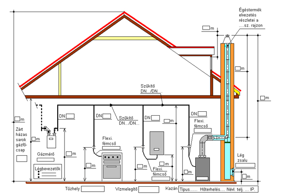 A tervek részletességére – és csak a részletességre - vonatkozóan ajánljuk mintegy példaként az 1. és a 2. ábrán bemutatottakat. Tesszük ezt annál is inkább, mert adott esetben rendkívül nehéz eldönteni a körülmények műszaki-biztonsági mibenlétét. Erre vonatkozóan említjük meg, hogy például egy égéstermék-elvezető rendszerben történt változtatás akár a lekondenzálódott víztartalom lefagyásához és az égéstermék-elvezetés megakadályozásához is vezethet.