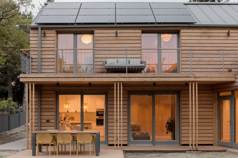 A Júlia projekt az Equinox saját fejlesztéseként valósult meg: a társaság tervezte, kivitelezte és értékesítette az épületet. A kétszintes, Z-alakban elrendezett épület két külön lakóegységet foglal magában, és tudatos tervezéssel biztosítja a természetes fény, a tágas terek és a privát kertkapcsolatok egyensúlyát. Az otthon kialakításánál a körforgásos gazdaság elvei és a fenntartható anyaghasználat kaptak kiemelt szerepet, a szerkezet és a burkolatok főként keresztlaminált fából (CLT) készültek, a hőszigetelés pedig cellulóz alapú, amely jelentős mértékben csökkenti a szén-dioxid-kibocsátást. A projektben alkalmazott Panasonic hőszivattyús technológia, illetve a napelemes rendszer hatékonyan optimalizálja az energiafelhasználást, miközben a természetes szellőztetés és az alacsony emissziójú anyagok a beltéri levegő minőségét is javítják. A Júlia ház a komfort, az energiahatékonyság és az esztétikus, emberközpontú design egységét képviseli jól példázva, hogyan valósulhat meg a fenntarthatóság a mindennapi építészetben.