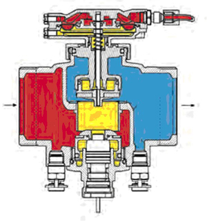 A kombiszelep az előbeállítása szerinti állandó értékre szabályozza a tömegáramot; a membrán közvetlenül a szabályozóbetét utáni, illetve előtti a nyomás függvényében végzi a szabályozást.
