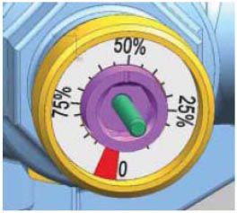 A szabályozóegység mindenkori állását könnyedén leolvashatjuk százalékban megjelenítve. Az előre beállított tömegáram szabályozó bármikor lezárható, ill. tetszőleges helyzetre állítható.